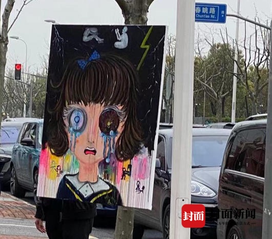 4月1日下午2点45分,小天的父亲拿着一副寓意反对校园欺凌的油画站在学校门口抗议。“我老公当天下午2点58分就离开了,只是想让学生家长了解这件事,并没有过激行为。”