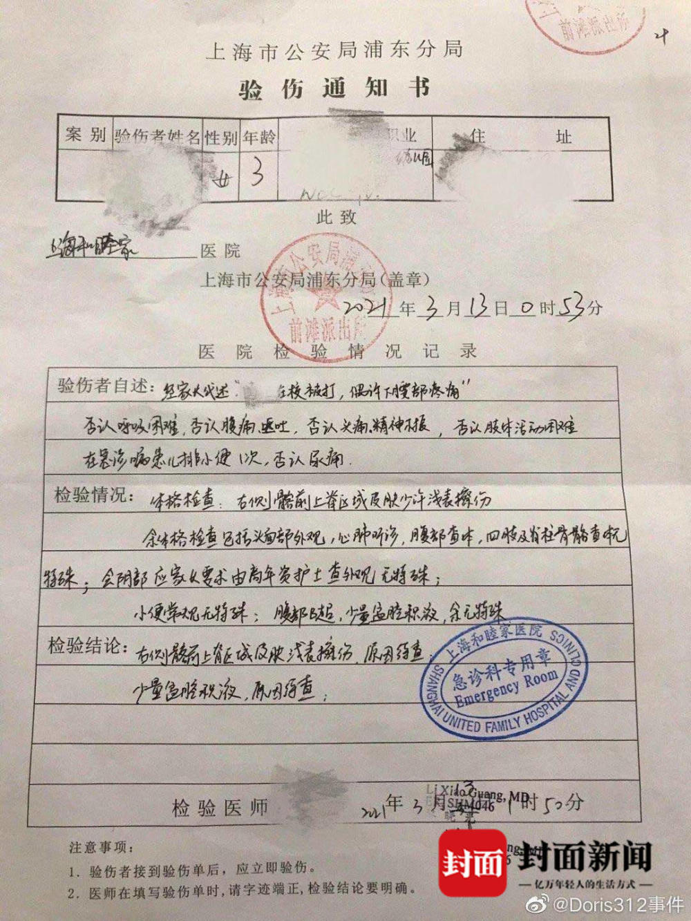 然而当天晚上,小天却说肚子疼。她赶紧带着女儿去医院检查。根据上海市公安局浦东分局出示的验伤通知书,小天在3月13日凌晨1点左右,前往上海和睦家医院进行验伤,检验结论为右侧骼前上背区域皮肤浅表擦伤,原因待查;少量盆腔积液,原因待查。