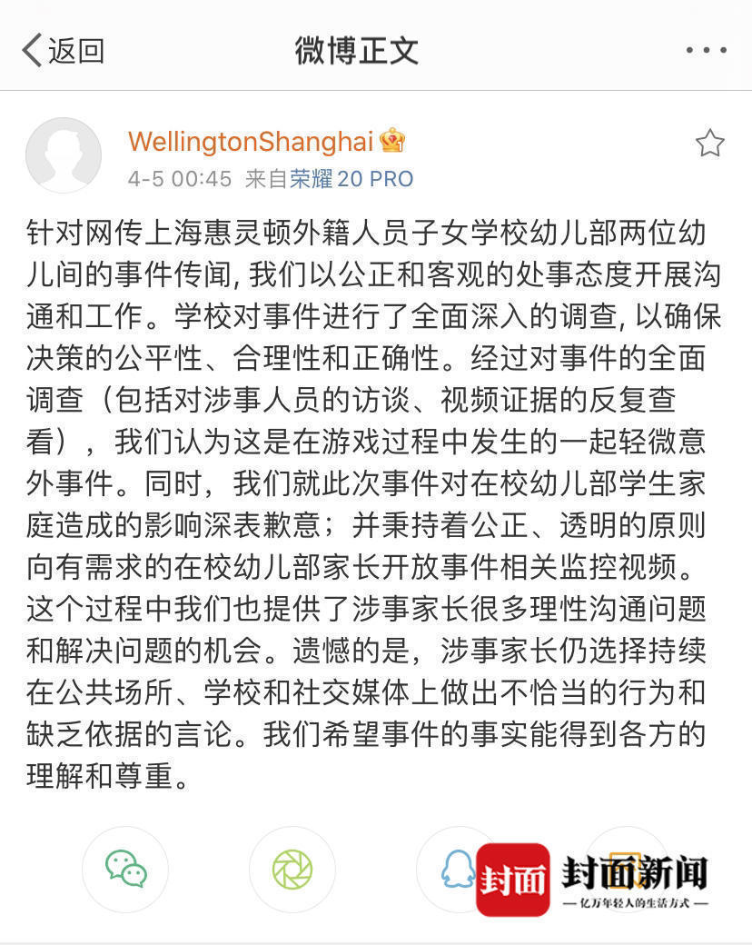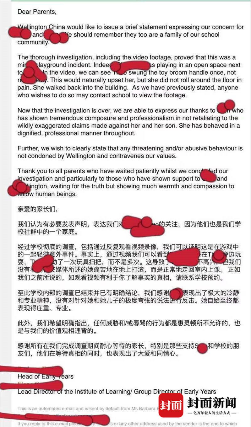 4月13日下午,记者致电该校两位管理人员了解此事,均无人接听。不过,该校曾通过微博@Wellingtonshanghai发布此事的调查结果,内容与上述发给学生家长的邮件并无太大差异,认定“这是在游戏过程中发生的一起轻微意外事件”,且“涉事家长仍选择持续在公共场所、学校和社交媒体做出不恰当的行为和缺乏依据的言论”。