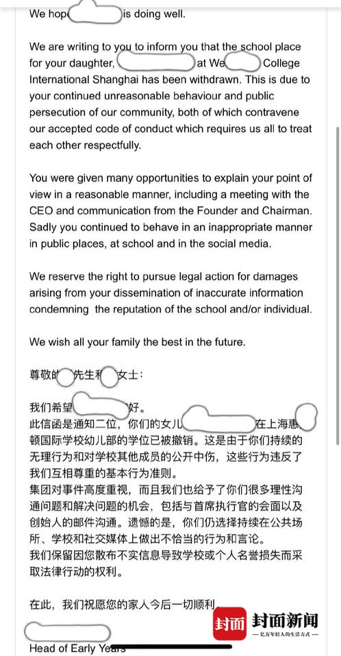 然而,当天下午4点48分,D女士收到了学校的邮件通知,校方表示由于“D女士夫妇持续的无理行为和对学校其他成员的公开中伤,小天在上海惠灵顿外籍人员子女学校的学位已被撤销。”