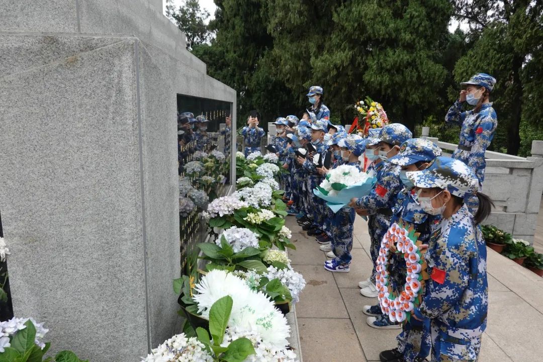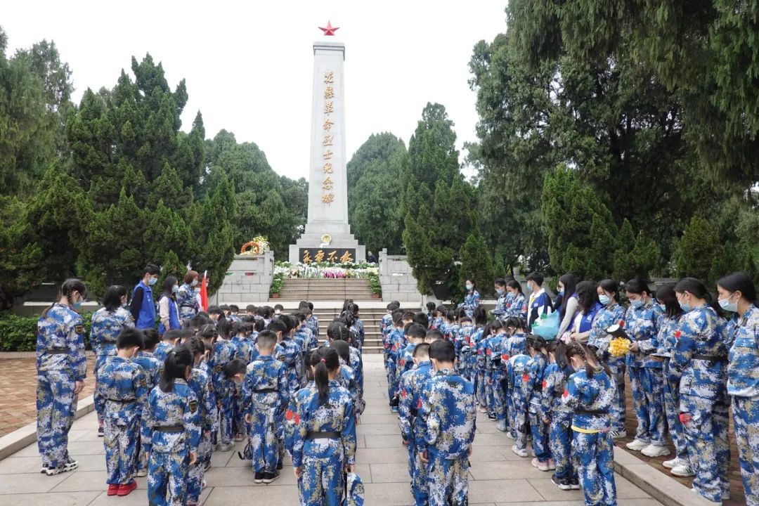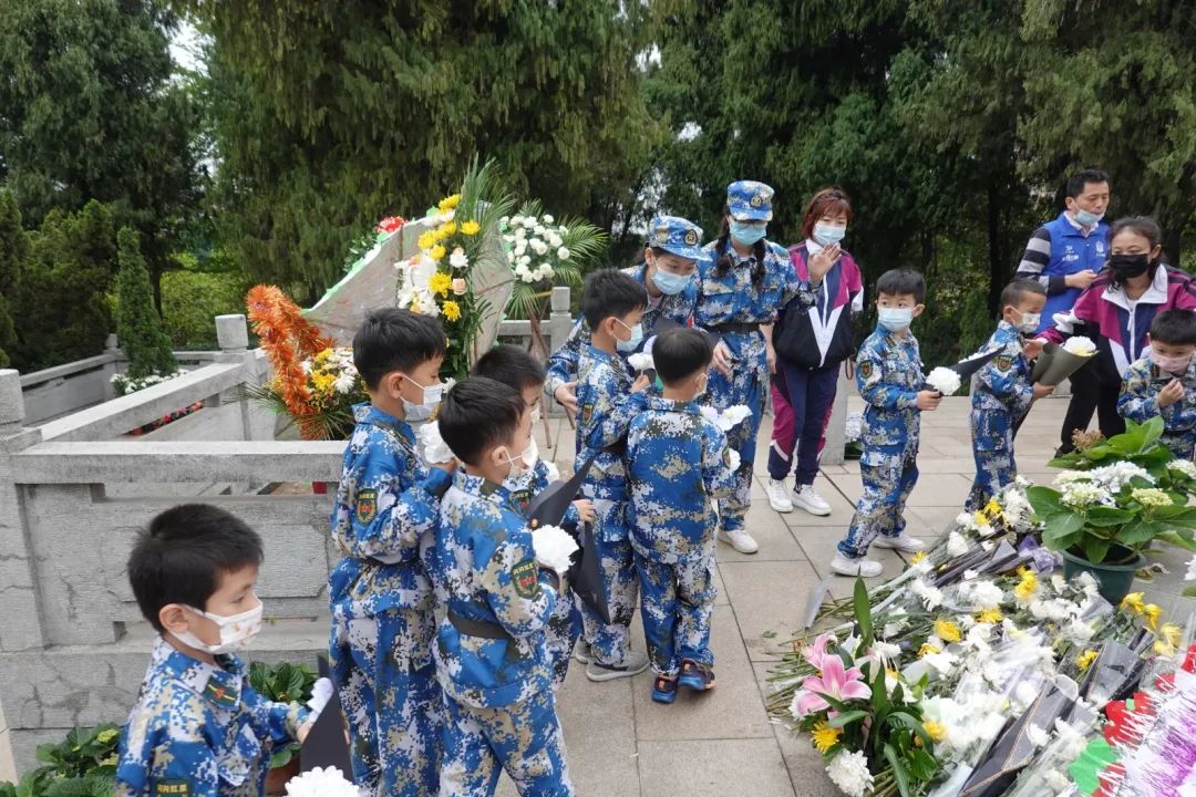 全体师生庄严肃穆默哀,献上心意卡、小白花、花圈,表达对革命先烈的深切悼念。100多名孩子齐声合唱中国少年先锋队队歌,献给英勇牺牲的革命烈士。