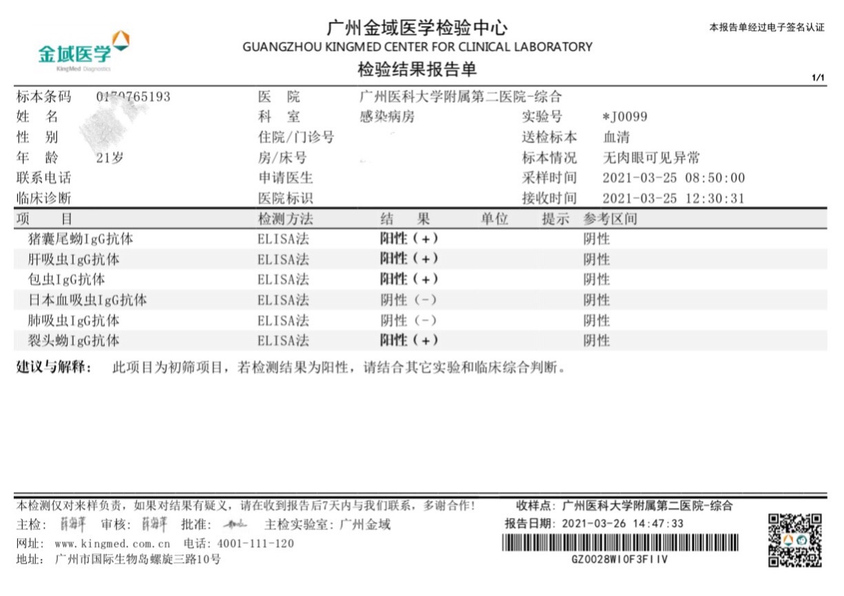 一番详细的问诊后,罗医生判断,小何吃过鱼生,考虑她感染肝吸虫的可能性很大,于是立即让她做寄生虫抗体相关检查。检查结果出来了,小何的肝吸虫、猪囊尾蚴、裂头蚴、包虫四项抗体指标均显示为阳性!
