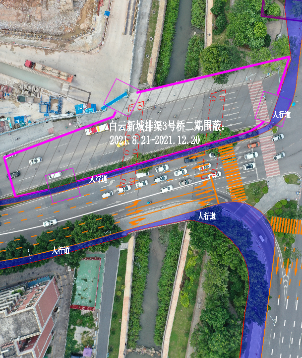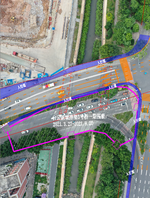 根据地铁12号线项目施工年度计划总体安排,2021年3月29日起,地铁12号线新市墟站至白云文化广场站2座车行桥将分期、分段开展桥桩基加固工程,该工程由中交隧道工程局有限公司进行施工,目前已在开展前期绿化清理及围蔽工作。计划第一期围蔽时间为2021年3月27日至2021年8月20日;第二期围蔽时间2021年8月21日至2021年12月20日。