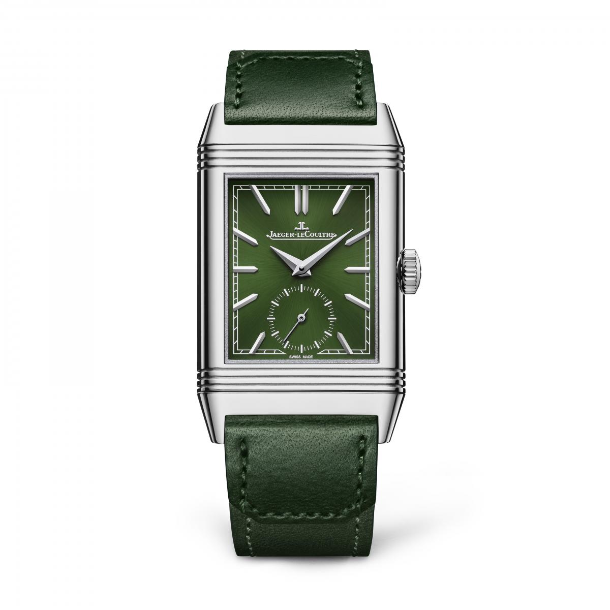 2021年,为呼应Reverso翻转系列腕表问世早期的色彩搭配,大工坊推出了绿色款Reverso Tribute翻转系列小秒针腕表。色泽浓郁的太阳放射状饰纹漆面表盘和相衬的皮制表带,令人想起汝山谷中环抱积家大工坊的青翠松林。