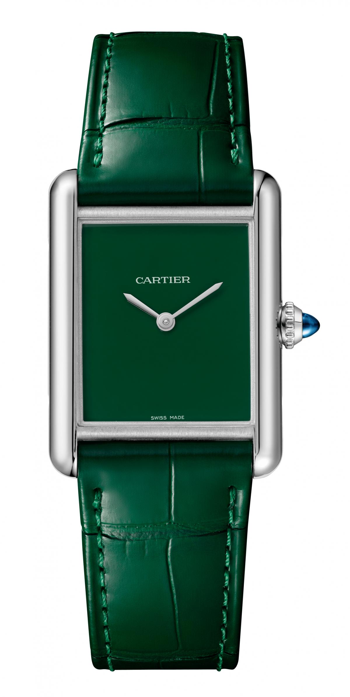 Tank Must腕表新作运用卡地亚三大标志性色彩——红、蓝和绿,致敬80年代精神。精钢表款摒弃罗马数字时标及分钟轨,采用简约风格表盘,同时搭配同色系表带,打造全然一体的单色外观。