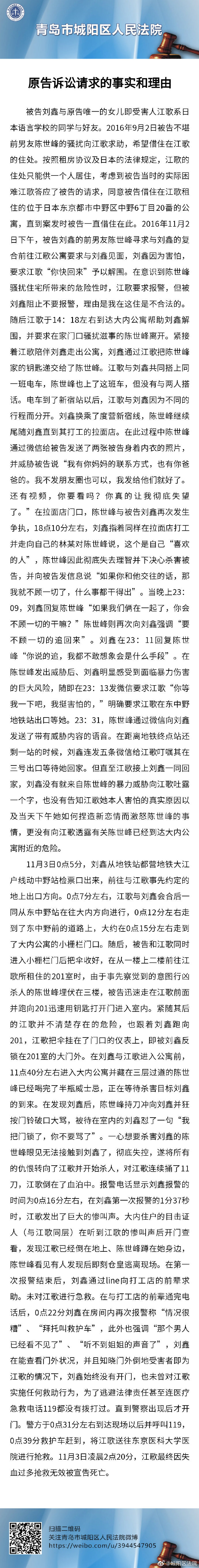 4月15日,江歌母亲诉刘鑫生命权纠纷案开庭一个多小时后,审理法院青岛市城阳区人民法院通过其官方微博公布了原告诉讼请求的事实和理由。原告江秋莲一方认为,刘鑫在提前知晓陈世峰会带来暴力伤害风险的情况下,刘鑫仍未向江歌吐露危险。
