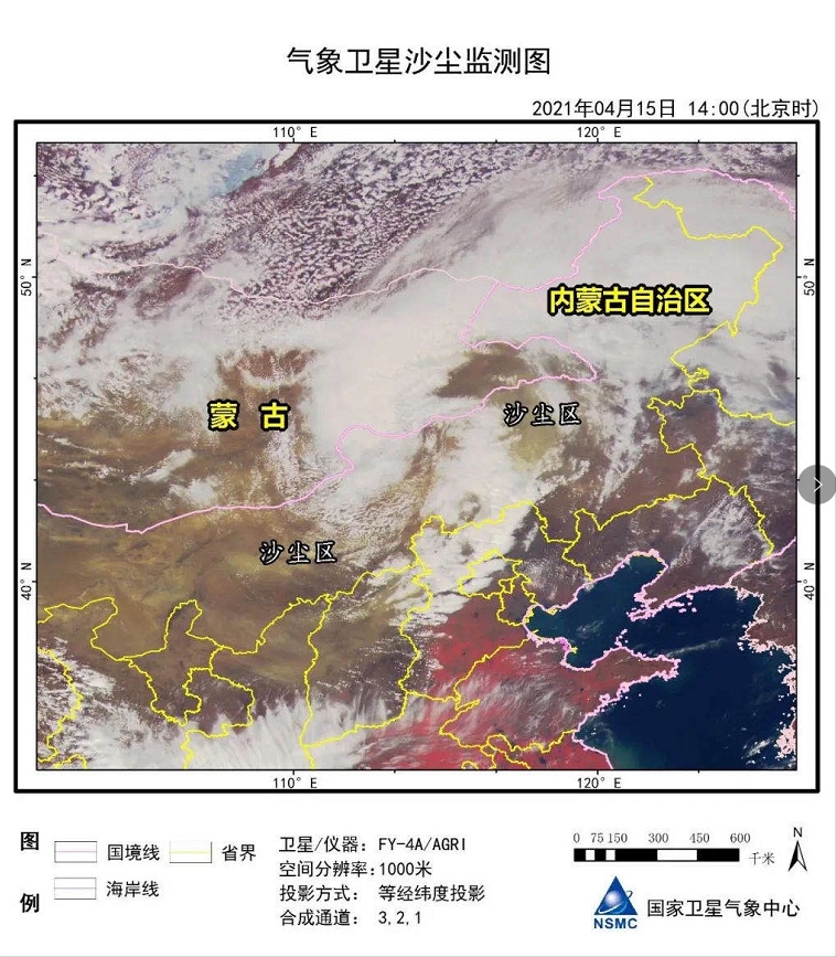 中国气象局表示,4月15日14时,风云四号气象卫星监测资料显示,我国内蒙古和华北地区已出现沙尘天气,卫星监测到的沙尘区可视面积约为18.8万平方公里。