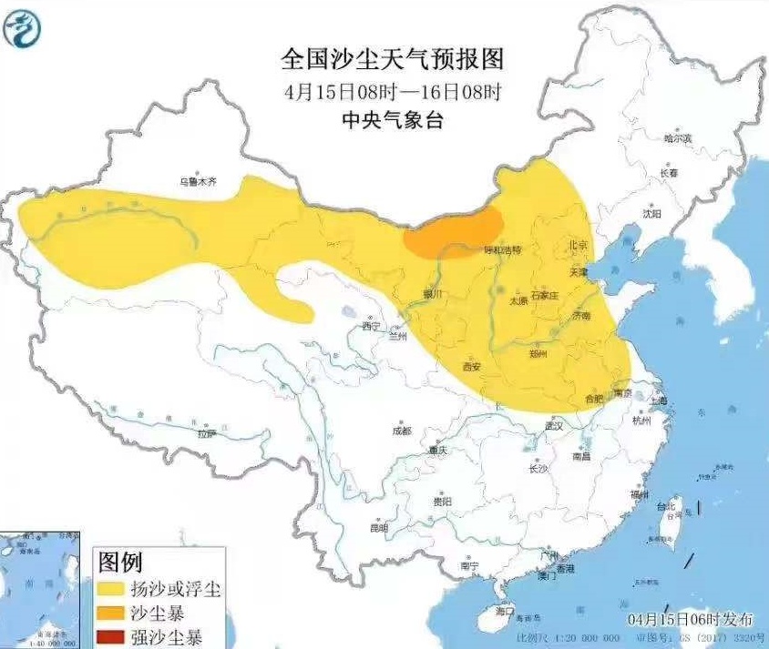 从预报来看,预计15日08时至16日08时,新疆东部和南疆盆地、青海西北部,甘肃中西部、内蒙古中西部、宁夏、陕西中北部、山西、北京、天津、河北、河南、山东中西部、安徽中北部、江苏北部等地将出现扬沙或浮尘天气,其中内蒙古中西部部分地区有沙尘暴。