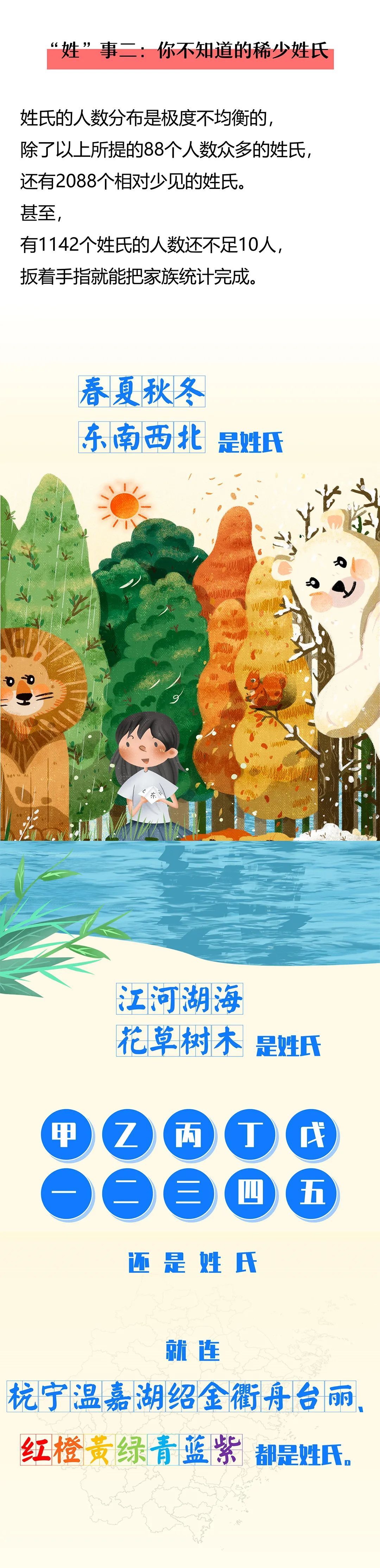 统计发现,梅兰竹菊、喜怒哀乐、风花雪月、日月星辰等词语中的字都是浙江人使用的姓氏,还有春夏秋冬、东南西北、江河湖海、花草树木、甲乙丙丁戊、一二三四五、红橙黄绿青蓝紫,连浙江11个设区市的简称(杭宁温嘉湖绍金衢舟台丽)也是姓氏。