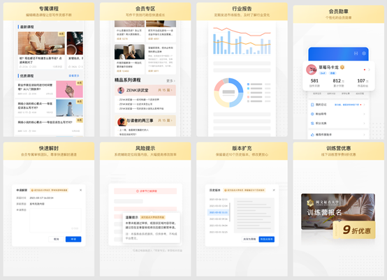 新推出的线上会员制度包含会员专属精品课程,快速解封,风险提示等八大功能。在这些功能中,精品课程最受关注,它包含主题课程和专栏课程两部分,邀请行业资深编辑和成名作家授课,除得到资深编辑结合行业视角给予的针对性课程外,会员还可以看到丁墨、孑与2等阅文白金、大神作家为会员打造的专属课程。快速解封和风险提示亦是线上会员的两大特色功能。