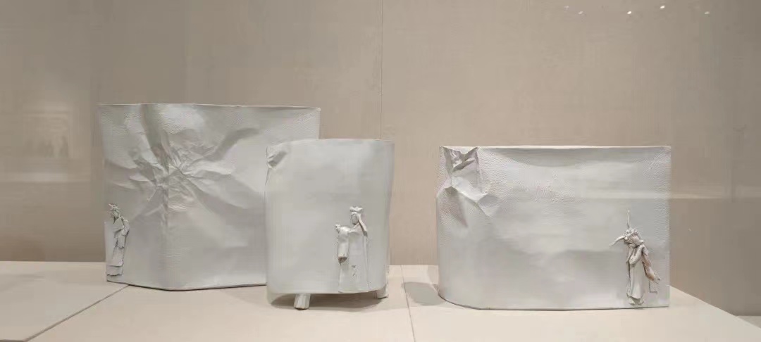 《一纸人生》系列则传达出范安琪想要表达的人生哲学:人生如纸平平折折,斑斑点点,凹凹凸凸。在作品中,她运用“纸”元素质感成器物之形,上面贴、捏泥塑戏曲人物,有如纸上说人生。釉色则运用新研发的“纸釉”,以“白纸”“黑字”二色为主调,把纸的特性彰显出来。在褶皱凹凸里感受其之美,在斑驳间体味丰华。“人生如画或浓或淡,或艳或素,或缺或整在浓淡艳素中静品其味,在缺失间体验当下完满。”她如是说道。