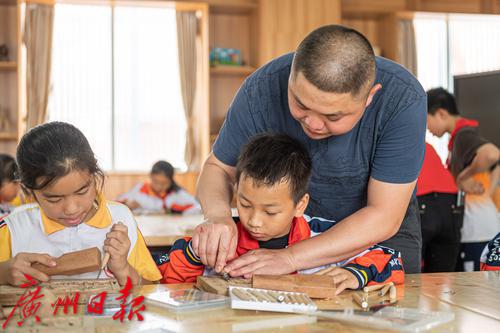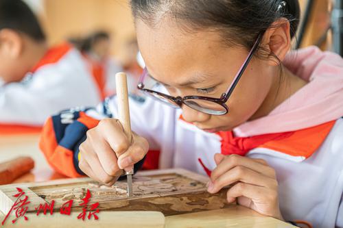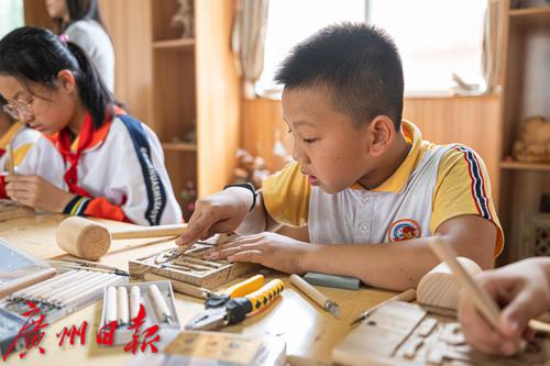 “叮叮叮”“铛铛铛”……4月13日下午,在从化罗洞小学的木作工坊教室内传出敲敲打打的声音,近20个小学生握着木刻刀细心地按照木板上的铅笔线条雕刻。在星期二这个寻常的上课时间里,这群小学生上了一节不寻常的课——木作手工艺课程。3月30日,罗洞小学开设了木作手工艺课程,邀请了专业的木匠进教学,之后这门课程将推广到各个年级,打造成特色校本课程。