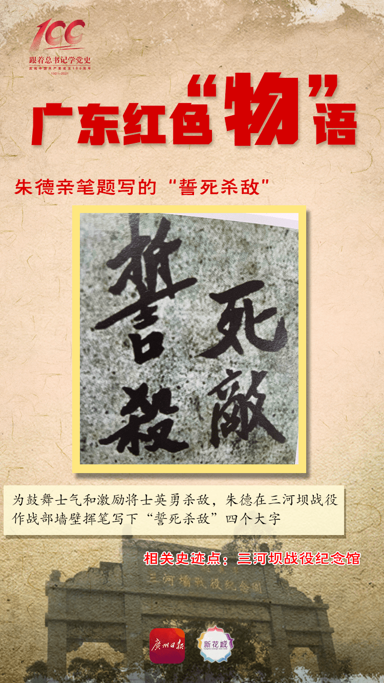 1927年10月1日,国民党钱大钧部2万余人,由今梅州市梅县区松口扑向三河坝,朱德和25师师长周士第、党代表李硕勋指挥了这场阻击战。为鼓舞士气和激励将士们英勇杀敌,共和国元帅、时任南昌起义军第9军副军长、三河坝战役总指挥朱德,当即在三河坝战役总指挥部的屋旁墙壁写下“誓死杀敌”四个大字。在这场生死攸关的战役中,蔡晴川、游步瀛、孙树成等上千名起义军将士、农军和游击队员壮烈牺牲,鲜血染红了三河坝大地。