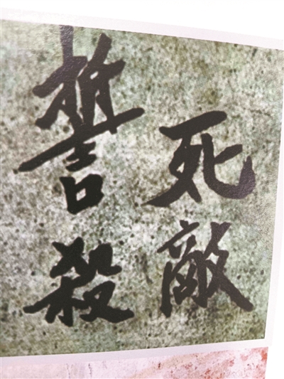 朱德在指挥三河坝战役时书写的“誓死杀敌”四个墙体大字。