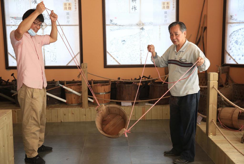 ▲文叔在街道办工作人员的协助下,展示农业生产过程中,如何快速使用水桶打水。