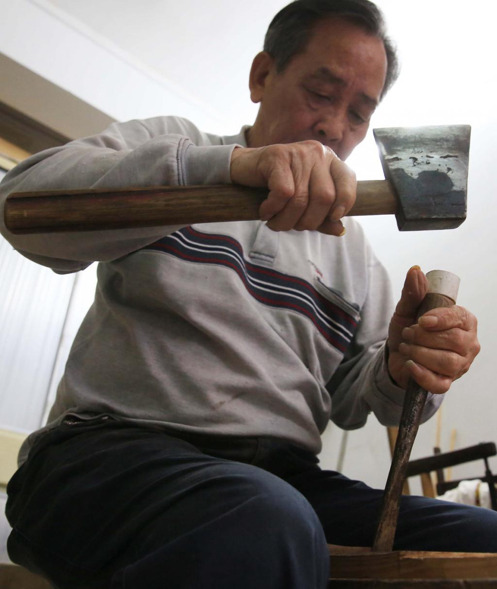 ▲文叔坚持手工制作农具,一块普通的木头,经过数十道工序才能成为农具。
