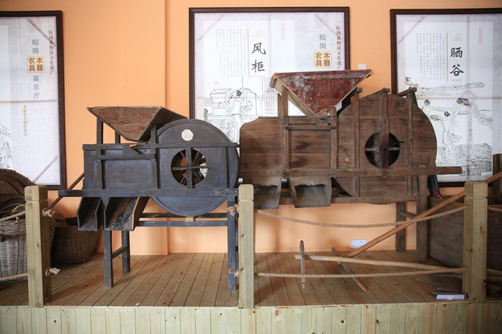 ▲展示厅内展出的农具 " 风柜 ",这是用来去除水稻等农作物籽实中杂质、瘪粒、秸秆屑等的木制传统农具。手摇转动风叶以风扬谷物,转动速度快产生的风也大,反之亦然。
