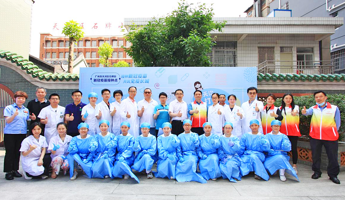临时接种点正式启动前,中山三院医护团队、石牌街道工作团队、石牌三骏企业集团部分志愿者合照。(摄影:池炳绍)