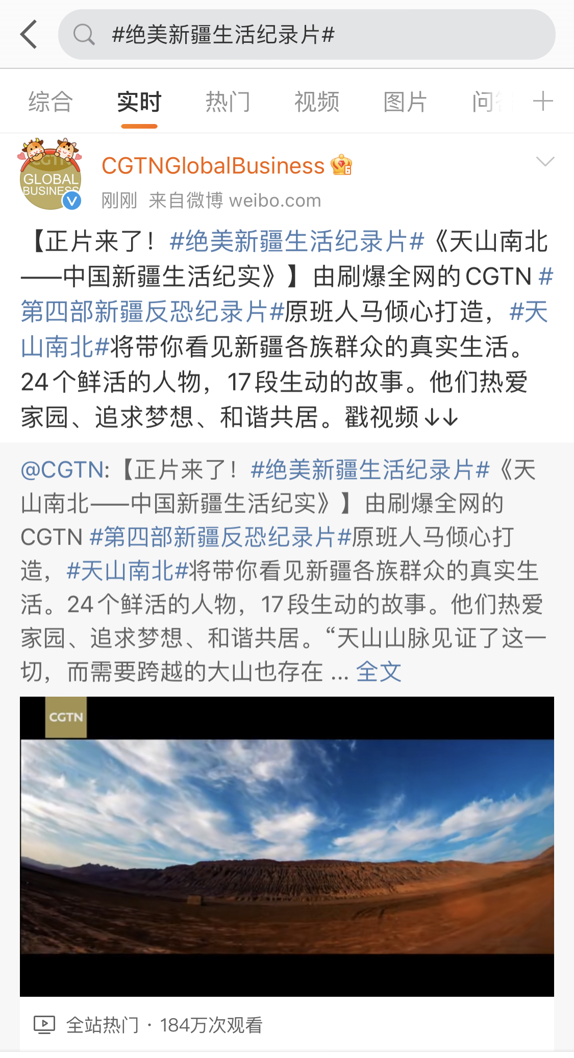 记者留意到,在BCI下架声明的同时,CGTN的官方微博同步上线了《天山南北——中国新疆生活纪实》,截止发稿前该片观看人次逾180万,热搜词条“绝美新疆生活纪录片”阅读讨论超1400万。