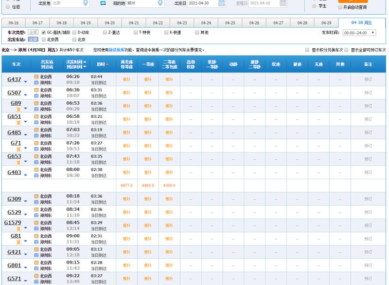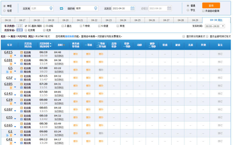 据铁路部门预计,五一假期主要以中短途旅游、探亲、学生客流为主,节日期间车票将会比较紧张。据官网,4月29日、30日当天一些热门线路的车票已经售罄。例如,昨天12:30开售没多久,4月30日北京至郑州、长沙、南京等方向的高铁、动车便已售罄。