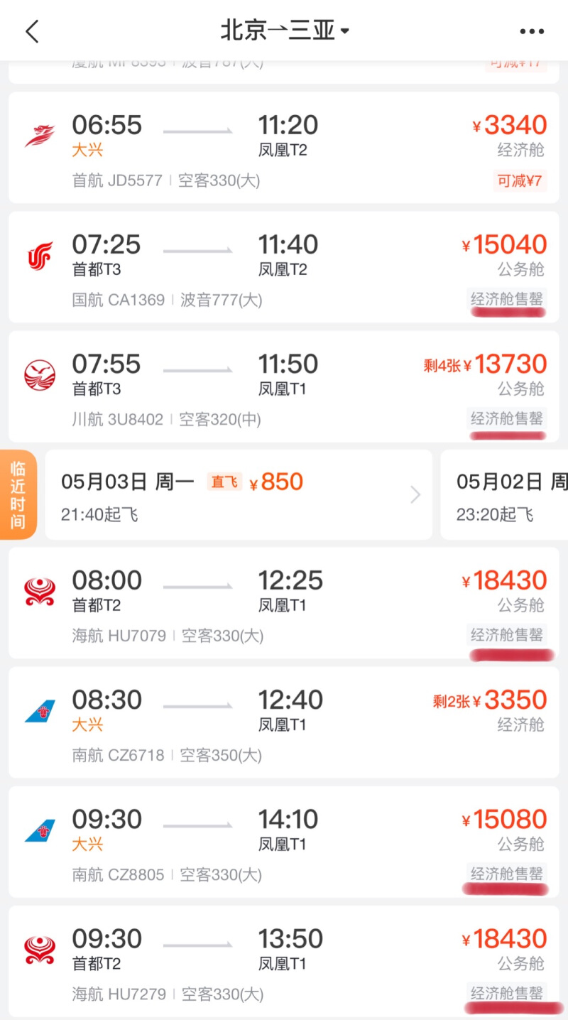 目前,“五一”热门航线机票预订非常紧张,比如北京到三亚的部分航班经济舱已经售罄。