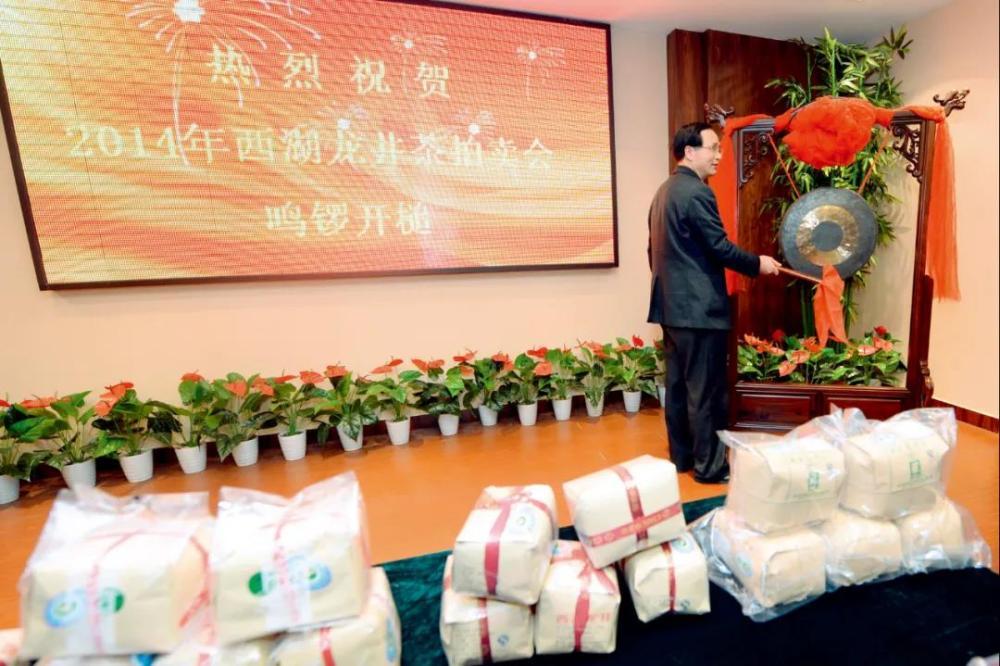 ↑2014年4月3日,2014西湖龙井茶拍卖会在位于浙江杭州市的中国茶叶拍卖交易服务有限公司开拍。图/新华