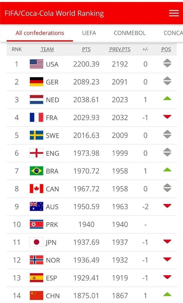 4月16日,国际足联公布最新一期的女足国家队排名,中国女足因为淘汰了韩国女足,排名上升1位,目前排名世界第14位,在亚洲排名第4位,排在澳大利亚女足(世界第9位)、朝鲜女足(世界第10位)、日本女足(世界第11位)之后。目前美国女足仍位居世界第一,德国女足和荷兰女足分列二、三位。