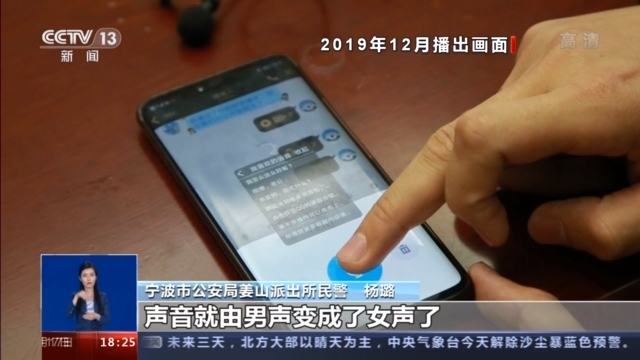 宁波市公安局姜山派出所民警 杨璐:我们在抓捕现场发现了一个变声器,上面有女声的(功能),这是一个。第二个就是通过网络软件,他就是通过搜索关键字,在这个软件上进行搜索,然后这个软件它会同步,根据它搜索的关键字会跳出语音包,或者类似的语句,然后他在这个语句上面直接选择的话,就可以把这类语句发送到微信上面,声音就由男声变成了女声了。