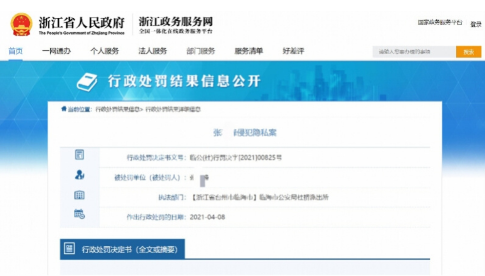 4月17日,记者从浙江省人民政府官网查询获悉,当事人张某峰用技术手段将女方项某醒手机内的微信聊天记录恢复,后将部分微信聊天记录发送至微信朋友圈及女方母亲及女方未婚夫母亲,构成侵犯隐私,被行政拘留6日。