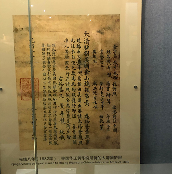 江门五邑华侨华人博物馆展出的华工图片。澎湃新闻记者 吴怡 翻拍而等待他们的,却是在漂洋过海中遭遇的船只超载、生存环境阴暗逼仄等苦难,大量华工在抵达美国前都因海难、疾病而失去生命,这种臭名昭著的招工也被称为“卖猪仔”。抵达旧金山海港后,华工立刻就会被关进狭窄阴暗的屋子中,与外界隔离。鸦片战争后,英法等国将护照制度引入中国以保护其侨民,对中国华侨护照制度的产生起到了启蒙作用。19世纪70年代,清政府驻外领事馆制度建立,并逐渐开始向华侨颁发护照,华侨护照由此诞生。华工黄华饶在光绪八年(1882年)拿到了由大清驻旧金山领事馆颁发的护照。目前,这张护照就藏于江门五邑华侨华人博物馆中,是该馆收藏的最早时期的中国护照。就在黄华饶拿到护照的同一年,1882年5月6日,美国国会通过了该国历史上第一个限禁外来移民的法案——《关于执行有关华人条约诸规定的法律》,即所谓的“1882年美国排华法案”。这让不少已经获得护照,甚至已经在美国定居的华人遭受孤立,许多华人仅仅因为种族因素而遭到残忍地殴打。然而,当时积贫积弱、内忧外患的清政府在保护侨民上已有心无力。