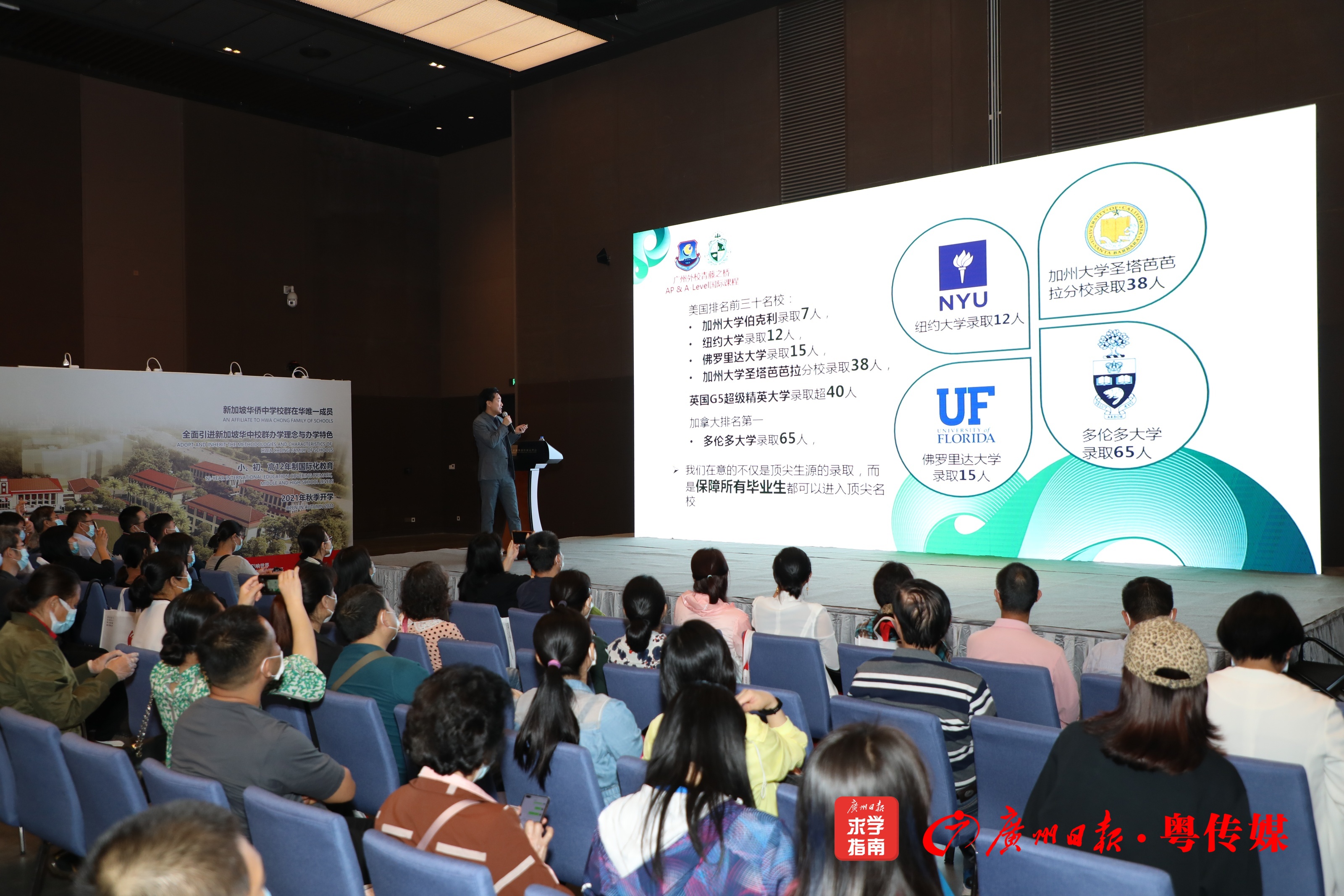 “我们最骄傲的不仅是顶尖生源的录取,而是保障所有毕业生都可以进入顶尖名校。”杨理皓介绍,今年,广州外国语学校中被加州大学伯克利录取7人,纽约大学录取12人,佛罗里达大学录取15人,加州大学圣塔芭芭拉分校录取38人,英国G5超级精英大学录取超40人,加拿大排名第一的多伦多大学录取65人。