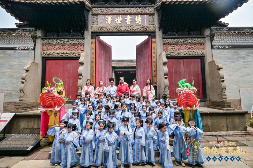 锣鼓喧天,娃娃欢声响遍天,文脉古镇,耕读传家耀沙湾。4月18日上午,沙湾古镇辛丑年第十届传统开笔礼首场活动在沙湾古镇全国重点文物保护单位——留耕堂内举行。