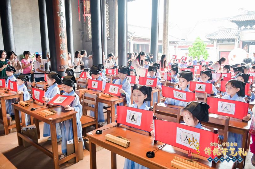 小朋友参加开笔礼仪式,通过司礼官教导,学会尊师重道;通过互帮互助、建立友谊;通过体验传统文化,让“人生第一课”更有意义。用毛笔手写第一个“人”字,代表着要读书首先学会做人,这正是开笔礼要传达和教育的核心内容,也是沙湾古镇在推广“旅游+文化”“旅游+教育”的一大亮点。