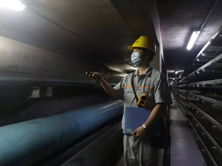 黄盛全打着手电,仔细地检查着水管有没有渗水、高压电线连接是否有松动、光纤是否有异常,同时,还要检查管廊内的氧气检测仪、温湿测试仪、照明设备、排风机等是否正常运转。如遇到问题,要及时汇报,并进行维修处理。就这样,他们几乎每天都要巡查一遍,一周要将18公里的管廊来回巡完,一年大概要走1800公里。