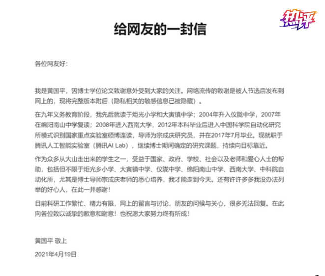 简单的信念,完成起来,却从来都不简单。黄国平的经历,也是很多从小山村一路奋斗走进大都市的人们的缩影,今天,他在写给网友的一封信中说,自己受益于国家、政府、学校、社会以及老师和爱心人士的帮助才能走到今天,对此深表感谢。进入高中后,学校免了全部学杂费,有好心人资助了生活费,他说自己抓住了“命运给他的一丝怜惜”。