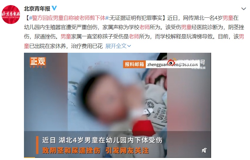 近日,网传湖北一名4岁男童在幼儿园内生殖器官遭受严重创伤,家属声称为学校老师所为。该受伤男童经医院诊断为,阴茎挫伤,尿道挫伤。男童家属一直坚称孩子受伤是老师所为,而学校解释是玩滑梯导致。目前,该男童已出院在家休养,治疗费用已花费一万多元。4月17日,男童家属接收到警方不予立案通知书,经审查认为:现有证据证明没有犯罪事实发生。男童家属想早日找到真相,还孩子一个公道。