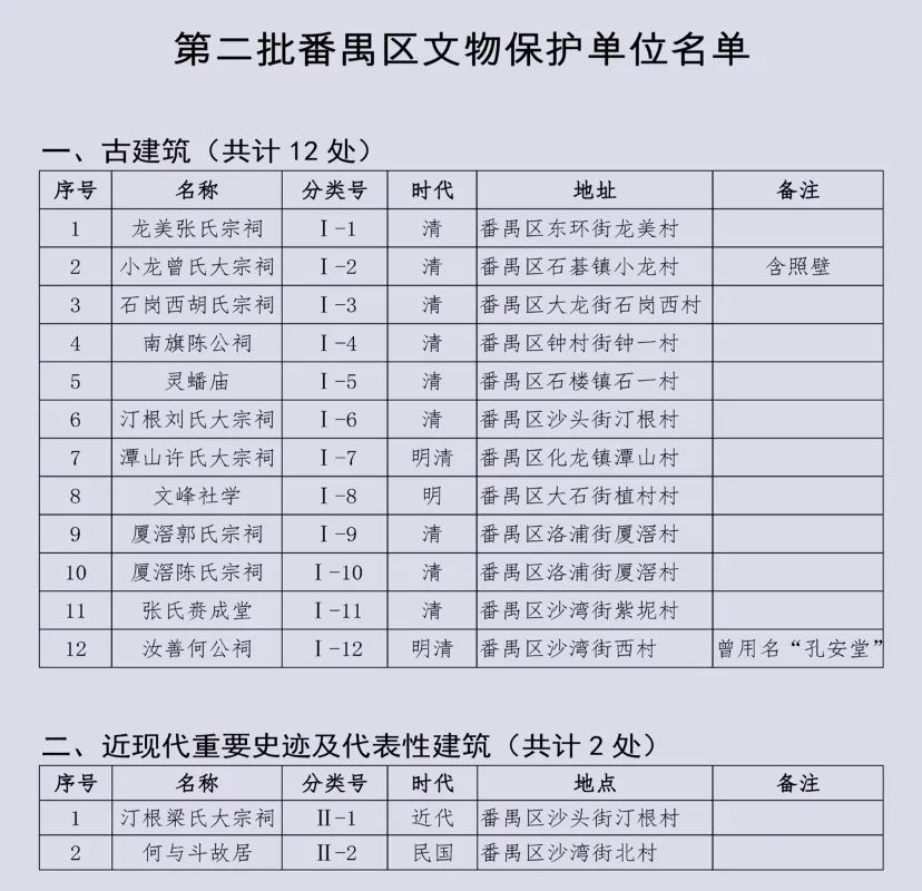 日前,番禺区人民政府公布第二批番禺区文物保护单位名单。据悉,第二批番禺区文物保护单位共14处,包括12处古建筑和2处近现代重要史迹及代表性建筑,其中一处是化龙镇潭山许氏大宗祠。