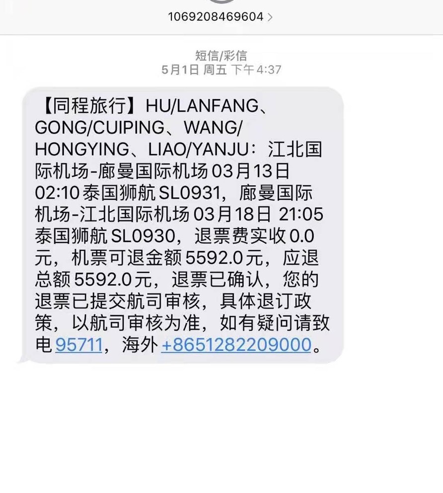 澎湃新闻此前报道,张女士和32名朋友2020年1月在同程旅行购买了从重庆往返泰国的机票,后因疫情防控需要不能出行。2020年2月下旬,张女士在平台给自己和朋友提交了退票申请。在平台申请退票后,只有12个人退了原票价(合计17183元),其余21人退的是代金券(合计30715元)。这33份往返重庆与泰国的机票出票时间虽然不一样,但往返时间相同,去程航班号为SLO931,返程航班号为SLO930。