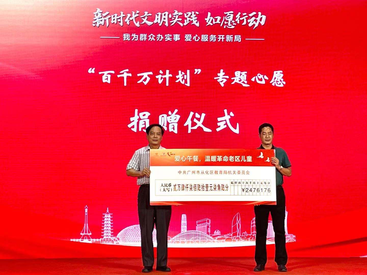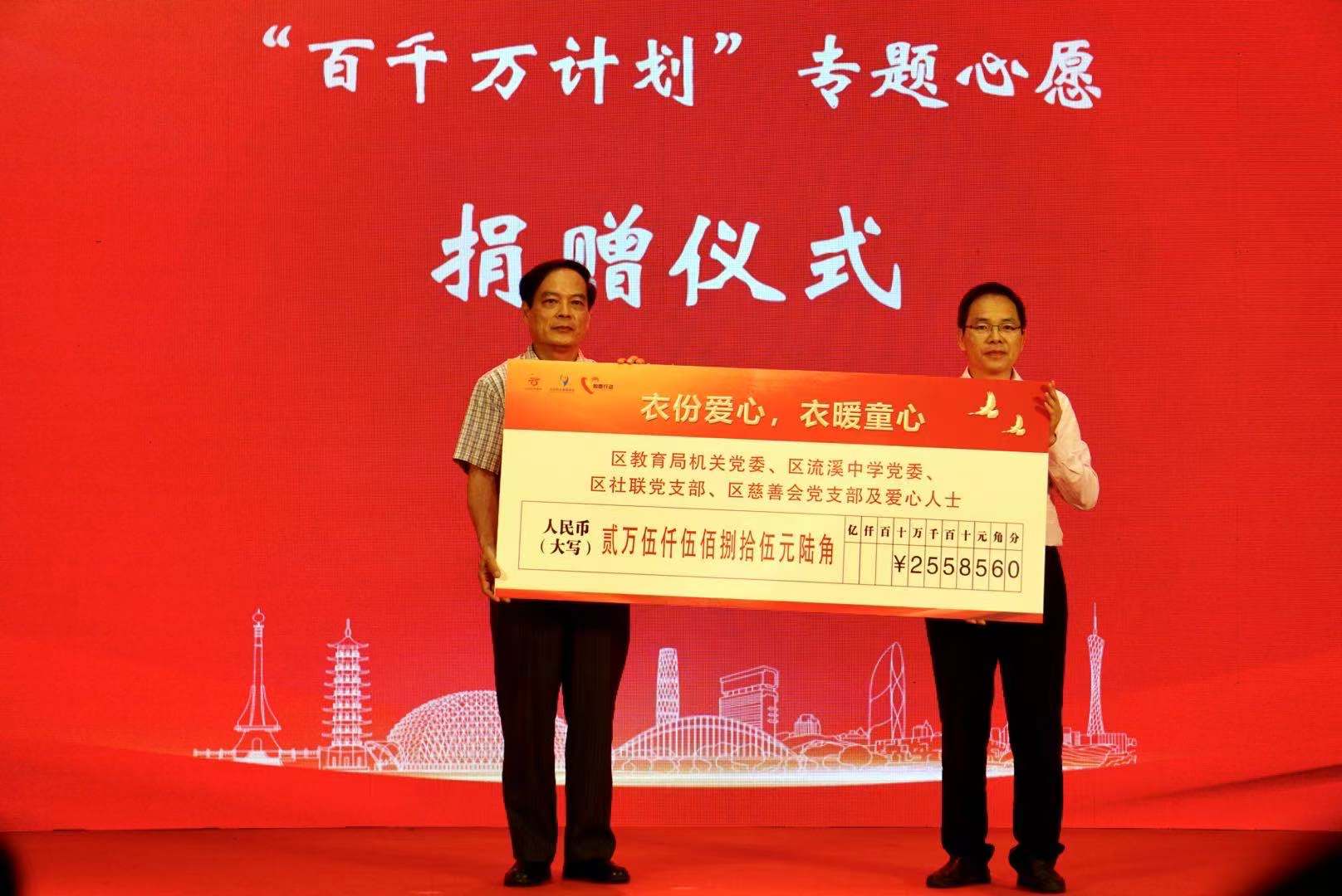 此外,在活动上,“百千万”计划的第一期党员现场认领了心愿。由中共广州市从化区教育局机关委员会、中共广州市从化区流溪中学委员会、中共广州市从化区社会组织联合会支部、中共广州市从化区慈善会支部等党支部发动党员以及广大群众,率先认领了革命老区的33名困难学子及93名特殊儿童的“微心愿”,为他们分别筹得一学期的免费“爱心午餐”以及夏、冬装夹棉校服各一套,合计共5万余元,充分发挥了以点带面、典型示范引领作用,引导党员干部亮身份、树形象。