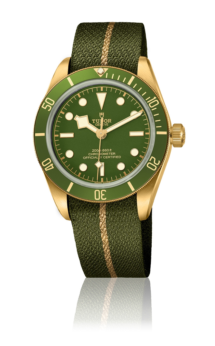 帝舵的新表款是首款选用18 ct黄金作为表壳材质,并配备透明表壳底盖的帝舵潜水腕表。饰以金色条纹的绿色提花织纹表带,是小巧型腕表与复古表款爱好者的心仪之选。