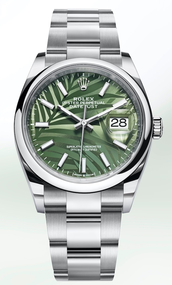劳力士新推出蚝式恒动日志型 36,其中蚝式钢款搭配蚝式表带与橄榄绿色棕榈叶图案表盘。棕榈叶图案让人联想到茂密且充满生机的热带雨林。搭载技术领先的3235型机芯。