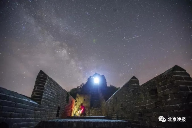 北京市天文爱好者王俊峰2017年4月23日在河北承德金山岭长城拍摄的天琴座流星雨照片。(王俊峰供图,来源:新华网)