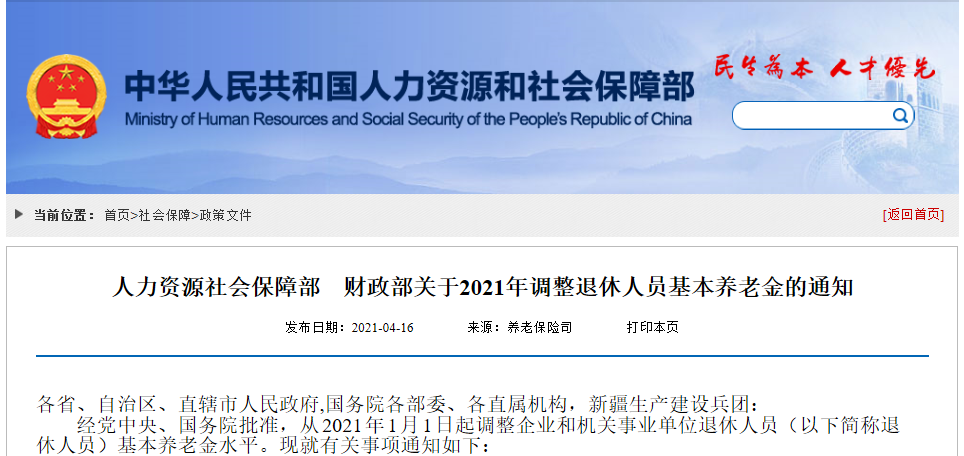 全国总体调整比例按照2020年退休人员月人均基本养老金的4.5%确定。各省以全国总体调整比例为高限,确定广东省调整比例和水平。