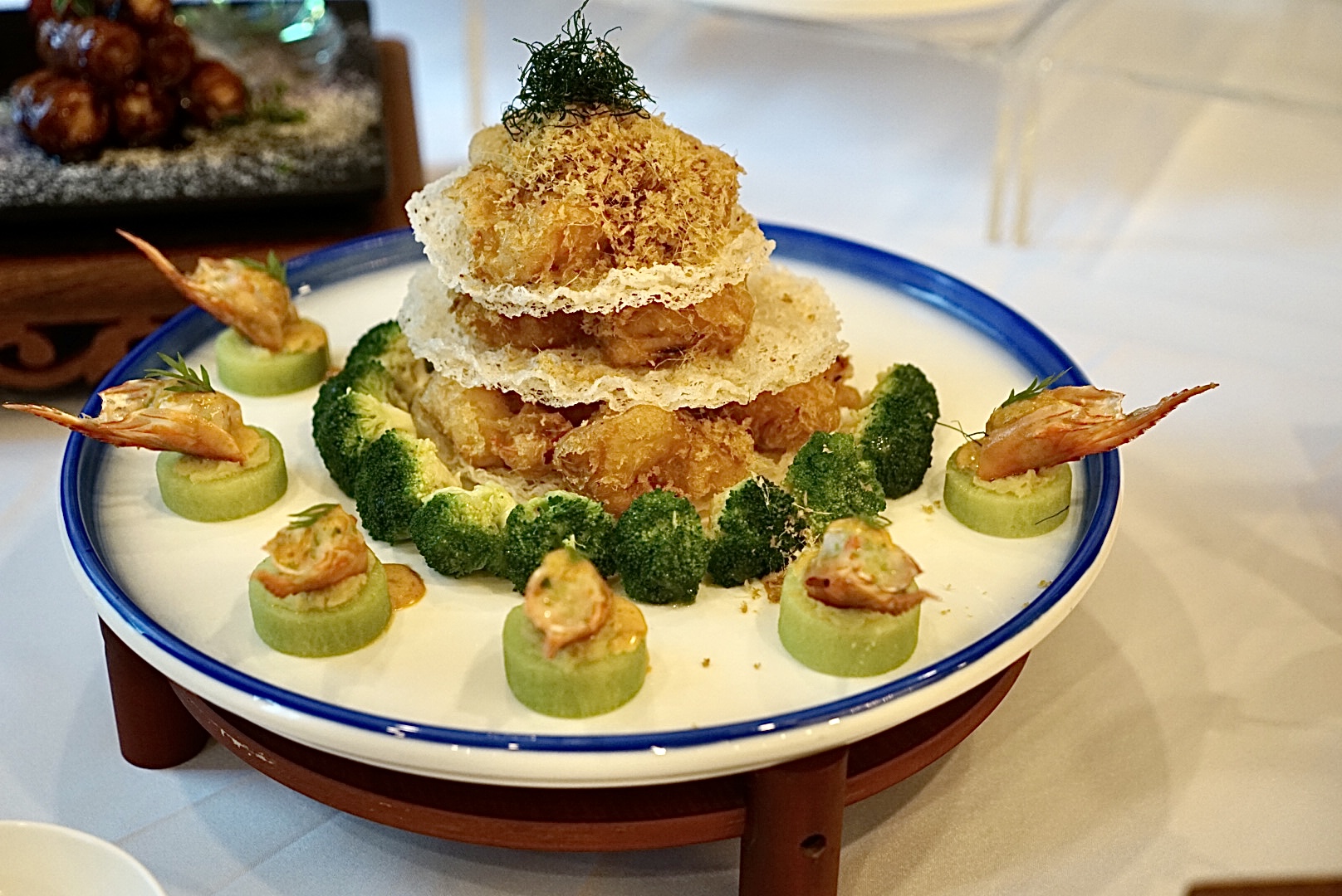 荷塘春月色则以鱼肉、莲子、蛋白、火腿等做出荷塘月色的意境,此菜既突出粤菜“清鲜嫩滑”的特点,更形象显露出粤菜“优雅脱俗”的风格;“荔熟秋蝉鸣”取岭南佳果元素,何物令得“一骑红尘妃子笑”?原是荔枝也!粤菜师傅巧妙运用鸡胸肉蓉做荔枝来比喻“果”,五花肉切片包卷荔浦芋来比作“蔬”,突出广东地区果蔬物产丰富的创作思维;广东属于沿海地区,虾本是居民餐桌常见之物,而姜则是粤菜烹饪之引物,“无菜不落姜”已为粤菜师傅的烹调手法,“金丝伴彩霞”运用多种烹饪法,采用一虾两食配以炸姜丝突出粤菜风味。