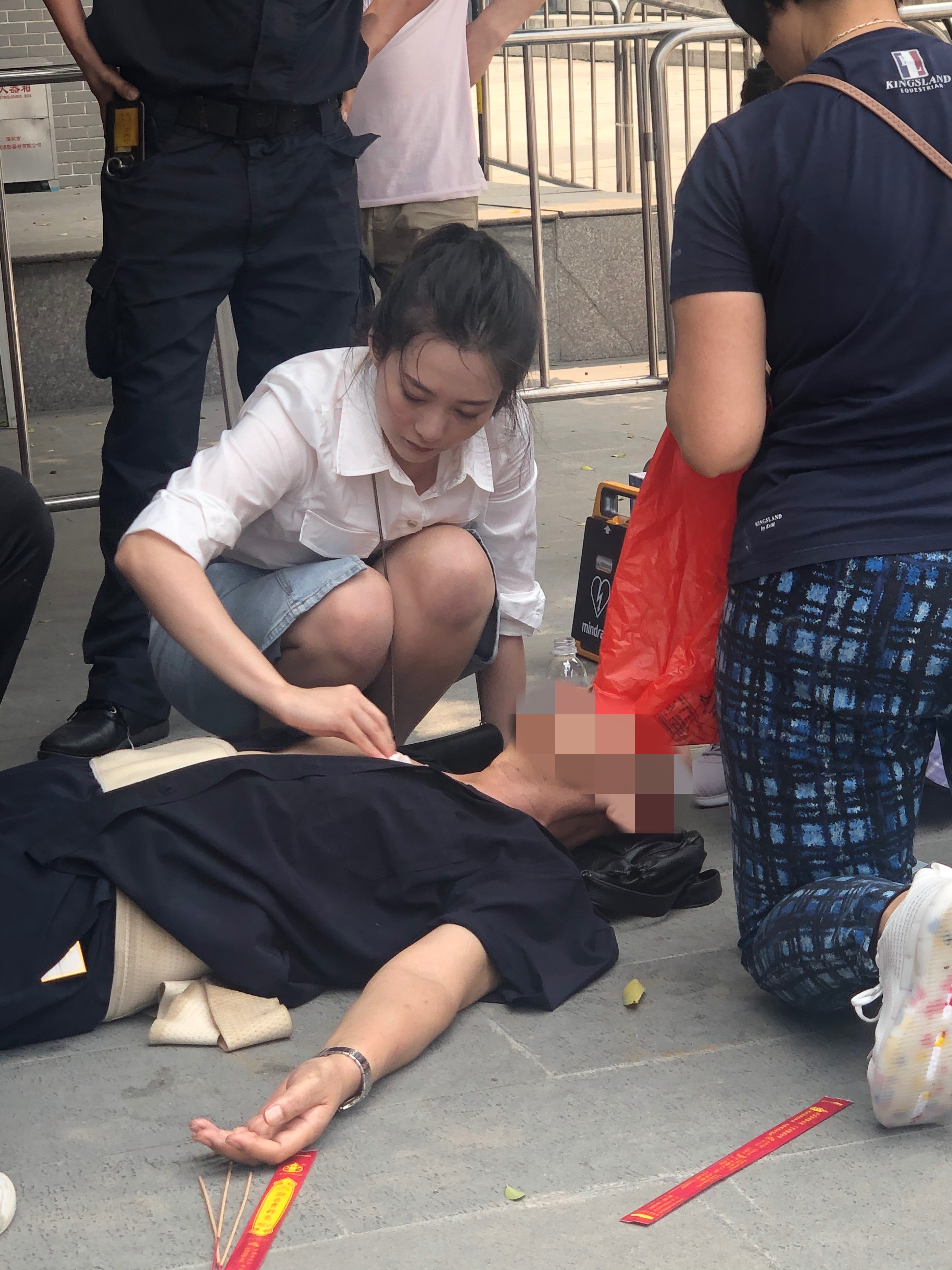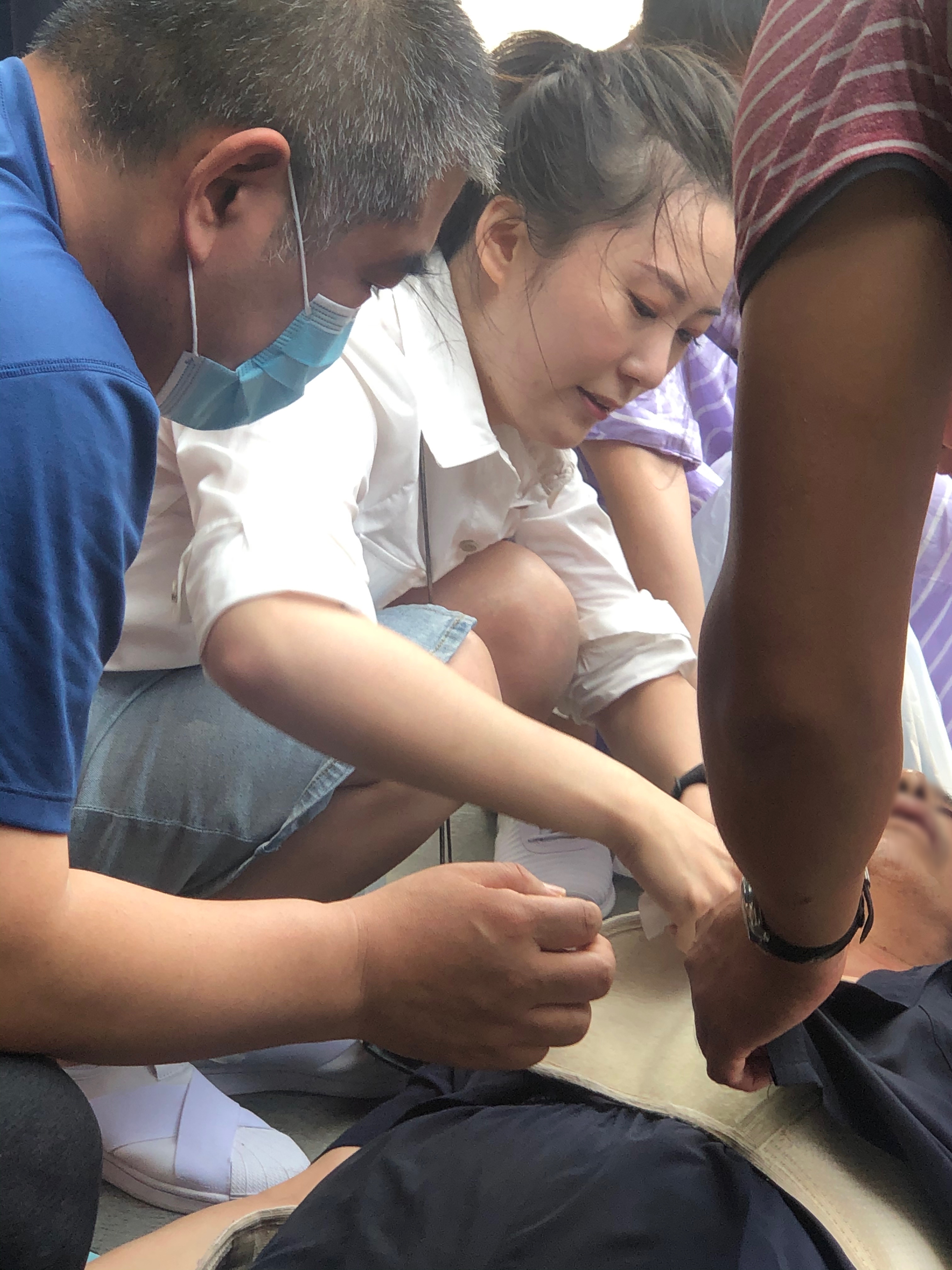 见状,孙浩茹快速地跑上前,一面调整瘫倒病人的姿势,让老大爷平躺以便开展救治,一面迅速指挥周围的游客让开位置,为老大爷提供更宽敞的救助空间和更充足的新鲜空气。