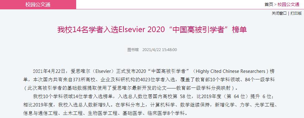 据了解,爱思唯尔“中国高被引学者榜单” 以Scopus数据库(全球领先的同行评议文摘引文索引库)作为统计来源,采用了上海软科教育信息咨询有限公司开发的方法。软科“中国大学排名”采用了爱思唯尔“中国高被引学者榜单”。入选爱思唯尔高被引学者榜单,意味着该学者作为第一作者和通讯作者发表论文的被引总次数在全国本学科的所有研究者中处于顶尖水平,具有较高的世界影响力,为该领域发展做出了较大贡献。