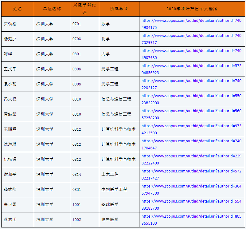 14位学者来自深圳大学的10个学科领域,在学科分布上,计算机科学、数学继续保持,并新增了化学、力学、光学工程、信息与通信工程、土木工程、生物医学工程、基础医学、临床医学8个学科。入选总人数位居国内高校第 58 位,比2019年度(第 64 位)提升 6 位;相比2019年度,入选总人数新增9人。