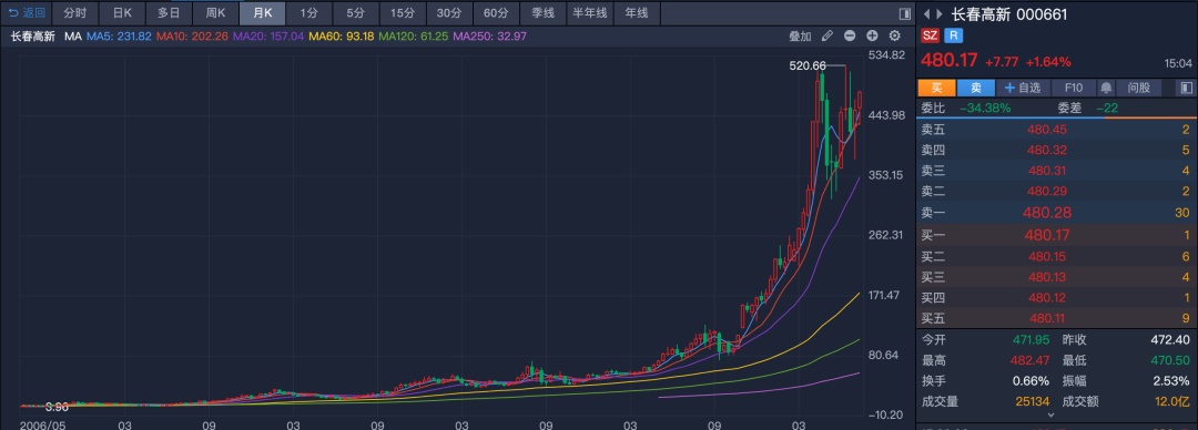 有聊天记录截图显示,阿姨投资的股票为长春高新。根据Wind统计,过去13年间长春高新最大涨幅超100倍,4月23日公司收盘价为480.17元,总市值1943亿。