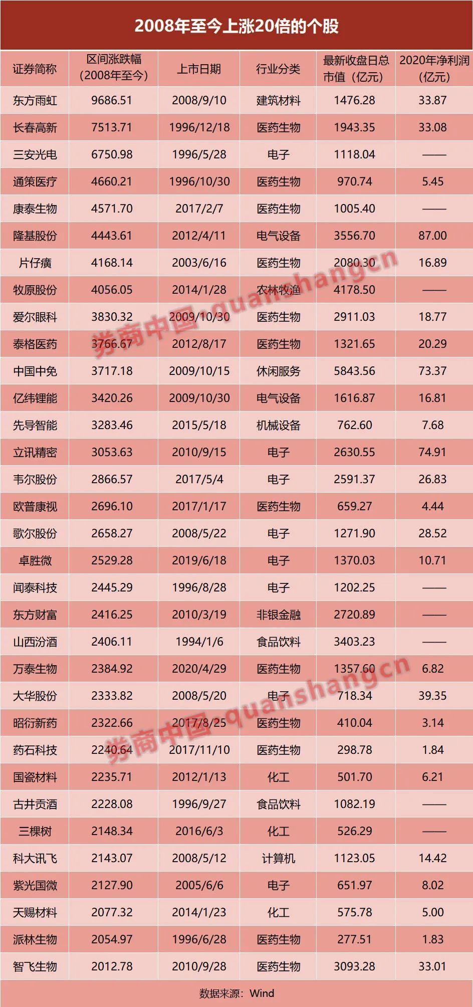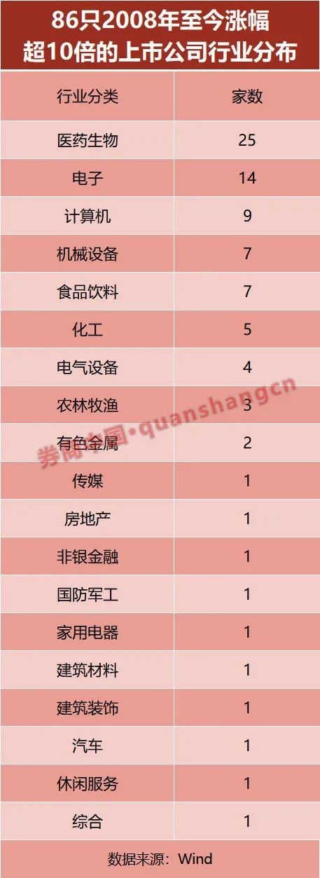 10倍牛股不止长春高新一个。根据Wind统计,2008年至今13年时间,涨幅超过10倍的个股共有86只。