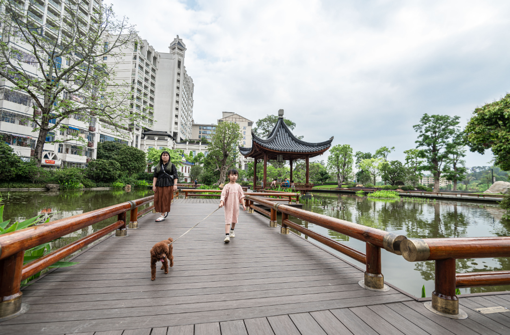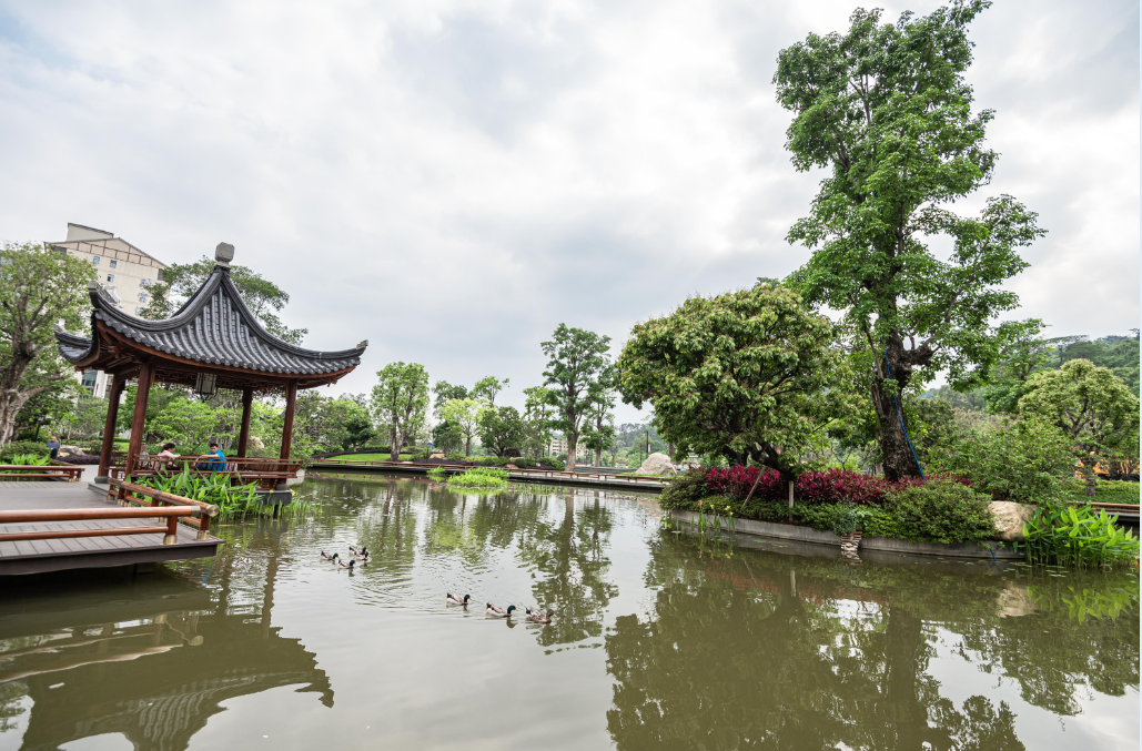 距离实践馆700多米之外是荔枝蜜公园。时逢春日,树影婆娑、绿意葱茏,一湖澄澈的春水倒映着岸边的古树,架在湖上的木栈道,嵌在湖边的景石,搭配着亭台楼阁,南方的秀美景色尽收在这23250平方米的开放空间里。这座2020年年初落建的公园成了市民的休闲好去处。住在附近的村民邓北新每天晚饭后就会出来散步,周末还会在这里“遛娃”,“我们农村又多了一个好去处。”